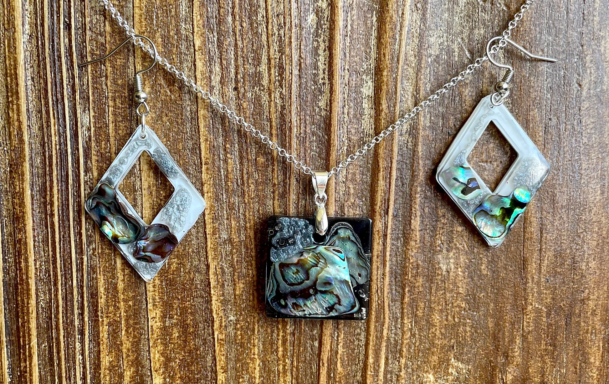 Diamond shape dangle abalone and white resin earrings. Product measures 1 1/2” long x 1” wide and have silver plated shepherds hook posts