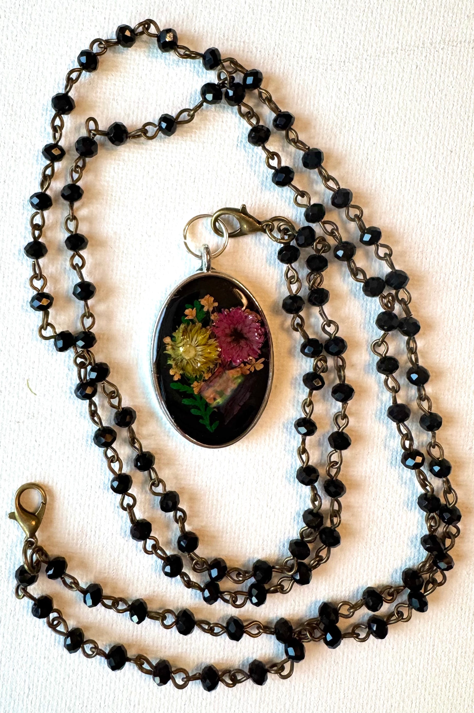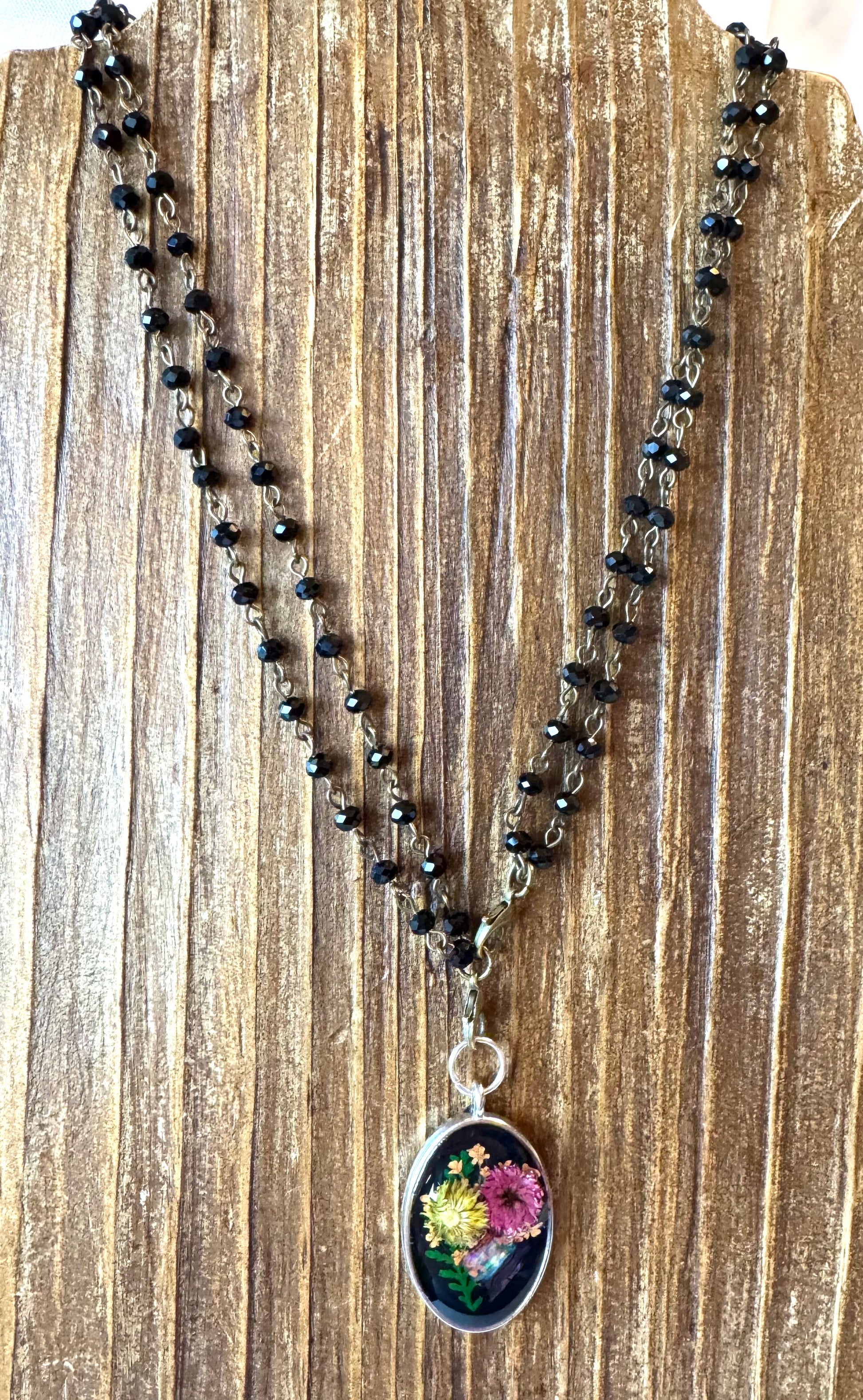 Mini flowers in resin pendant with black 16” chain that can convert to 34” chain