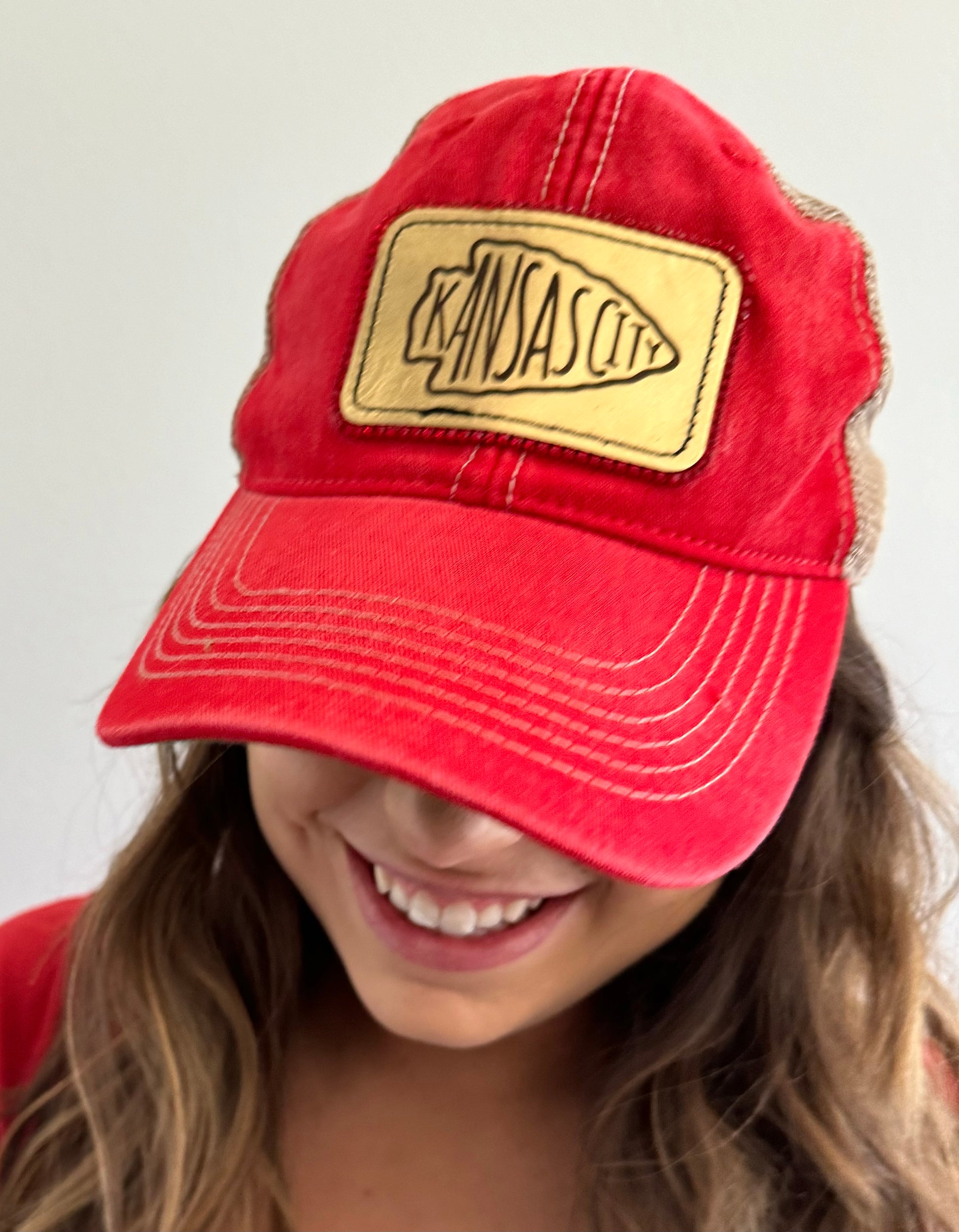 Red snap back arrowhead hat with gold leather patch and red bling trim. A beautiful hat for game day!