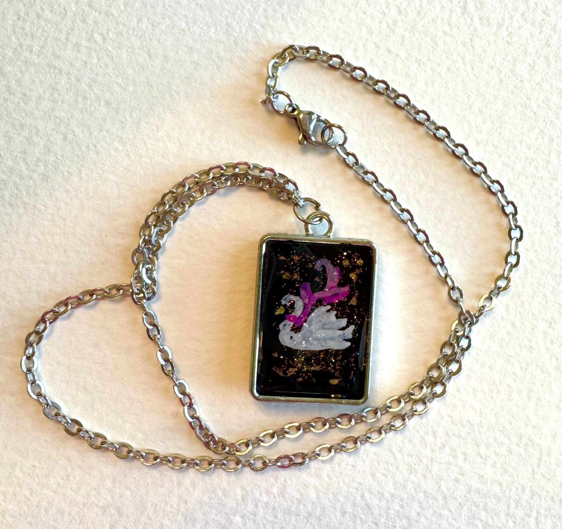 This sweet pendant is a hand painted swan and is sealed with resin. The pendant comes with 18” silver tone chain