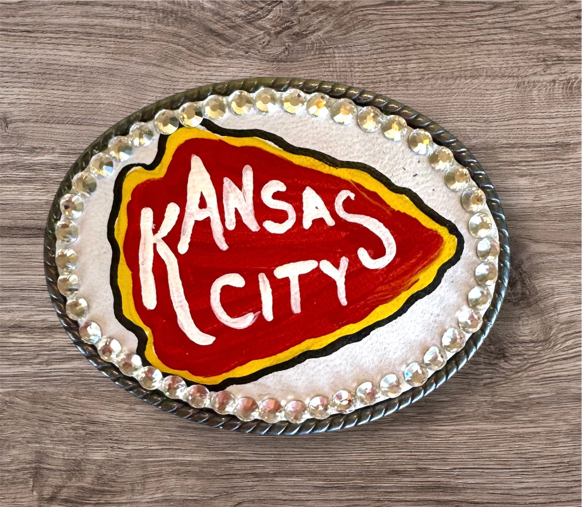 This 38mm buckle is hand painted on white leather, sealed for weather resistance and is surrounded with clear crystal for extra bling.